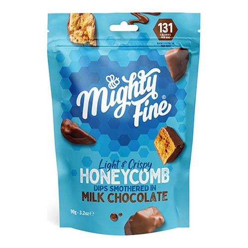 Our Mighty Fine Milk Chocolate Honeycomb Dips are light and crunchy and smothered in the best Free Trade milk Belgian Chocolate. Only 131 calories, and in a handy pouch, Mighty Fine honeycomb is a sugar rush to beat all others